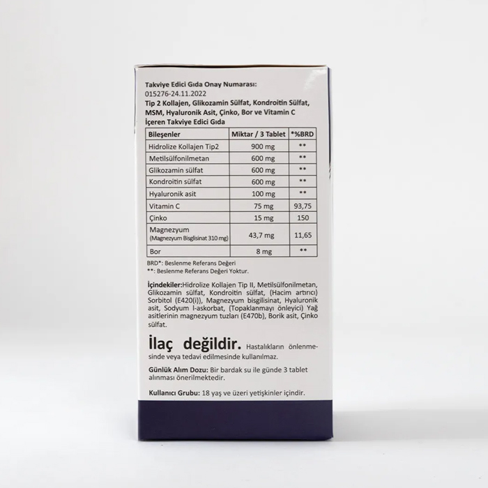 Bilesenler Miktar /3 Tablet: %BRD Hidrolize Kollajen Tip2 900mg Metilsülfonilmetan 600 mg Glikozamin sülfat 600mg Kondroitin sülfat 600 mg Hyaluronik asit 100mg Vitamin C 75 mg 93,75 Çinko 15 mg 150 Magnezyum (Magnezyum Bisglisinat 310 mg) 43,7 mg 11,65 Bor 8 mg